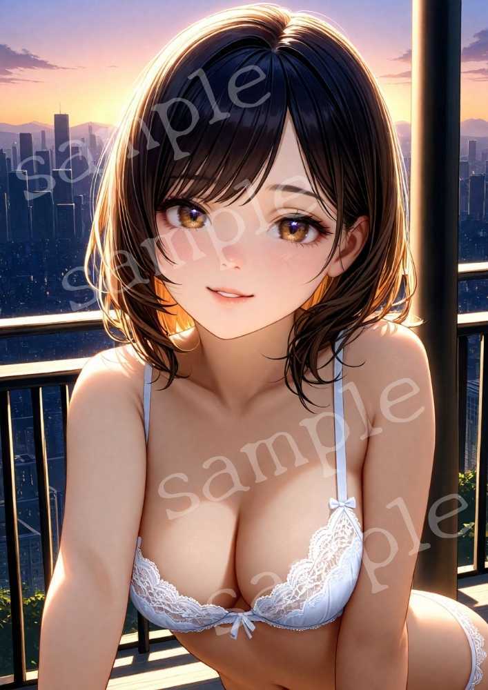 TA-0127 AIアート 美少女 夕焼け 夜景 高層バルコニー 白レースランジェリー 高画質 A4