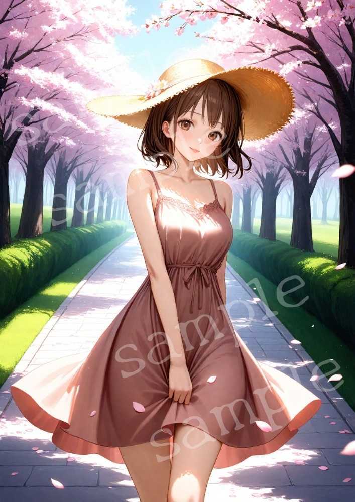 桜が満開の並木道で、麦わら帽子の女性がワンピースをひらっとさせるAIアートです。
