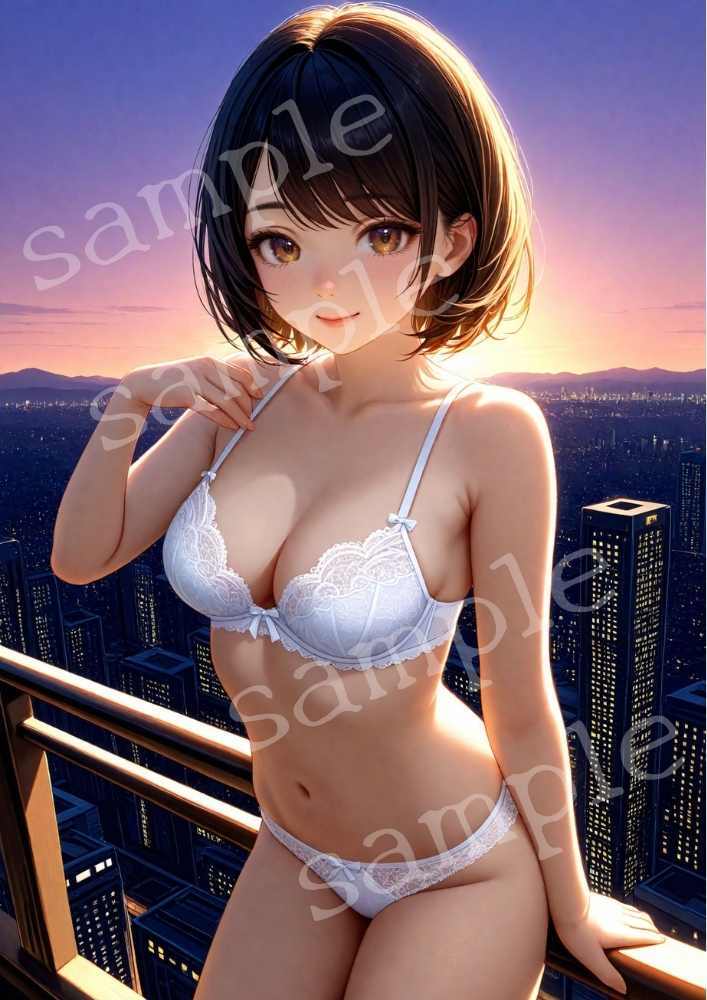 TA-0123 AIアート 美少女 白レースランジェリー 高層バルコニー 夕焼け 夜景 ショートボブ 高画質 A4